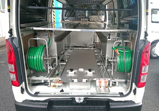 まずは貯湯タンク側水位計からです。運転席側のスライドドアを開け、作業前に水抜きをします。※水抜方法はこちら
