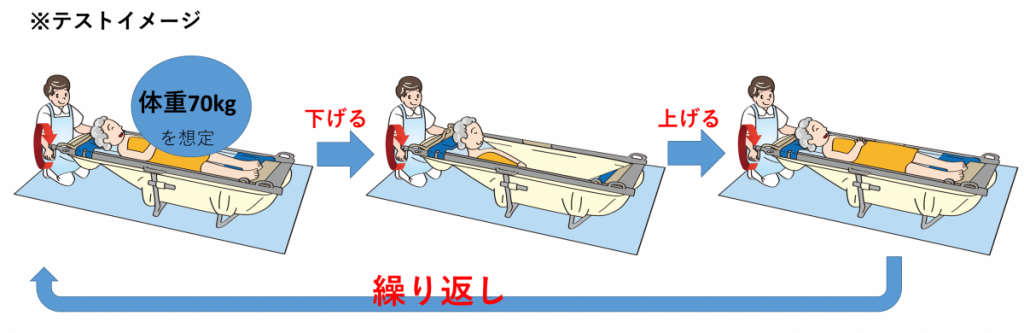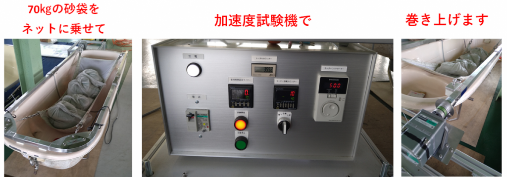 上記の作業を実際に作業するには労力・時間が膨大になりますので、 70㎏の重り(砂袋)と巻上げ作業は加速度試験機を用いてのテストを実施しています。