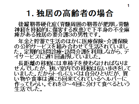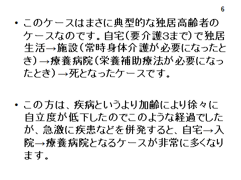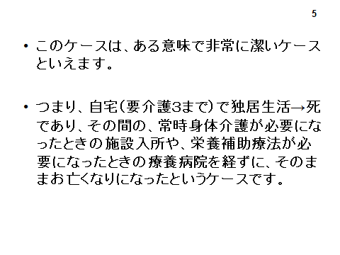この方の場合は要介護3で独居高齢者に多いパターンです。一人でトイレに行けなくなった時が、在宅介護の限界です。独居 生活から施設、さらに療養病院で亡くなるというのはゴールデンパターンと言えます。典型的な事例と言えるでしょう。