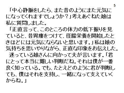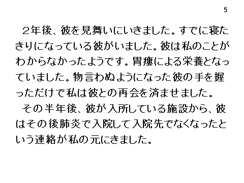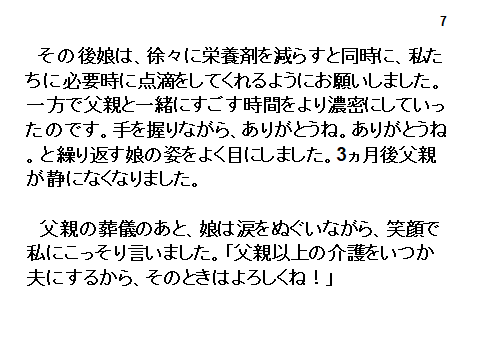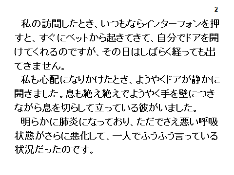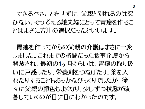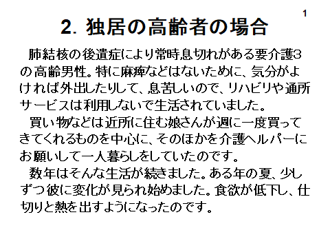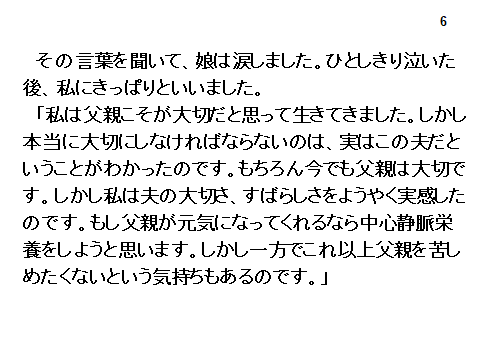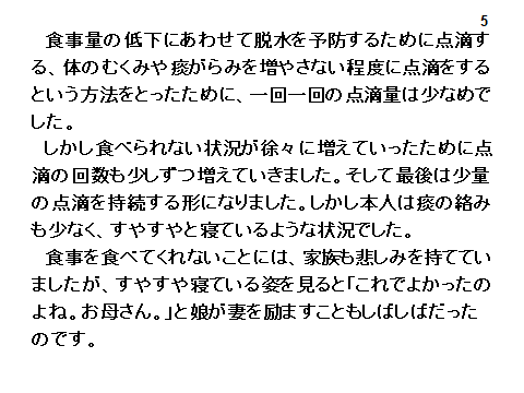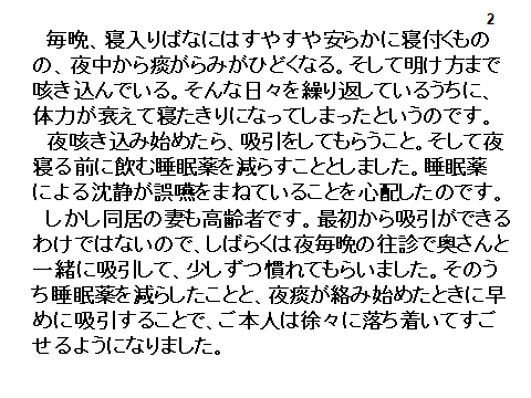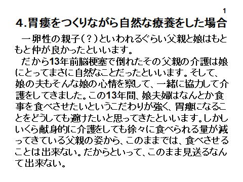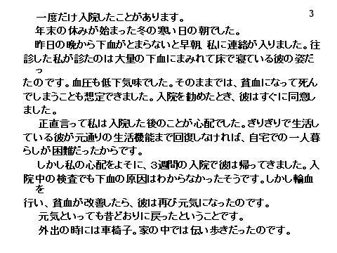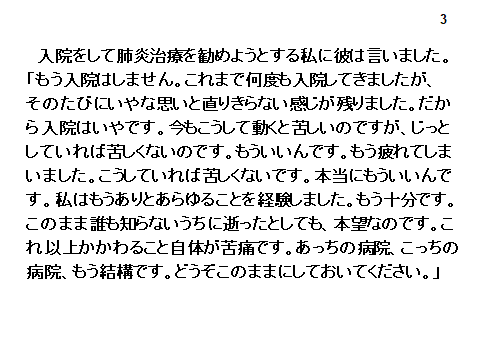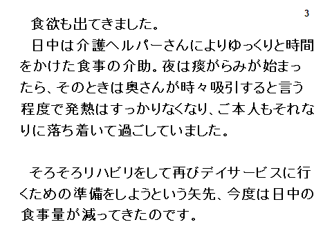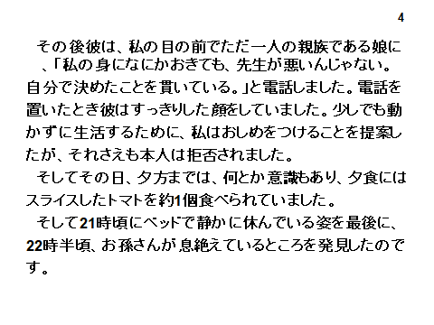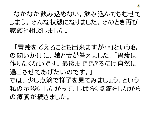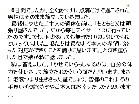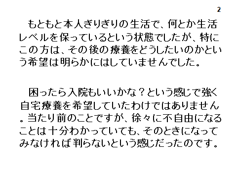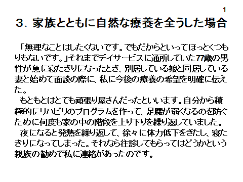 この方の場合は治療を断固拒否され、親族にもそのようにはっきりと意志を伝えていました。このケースでは➀本人の希望 の明確化 ②反対しない親族がいた ③私のように無理やり入院させない、いい加減な医者がいたというものですが、もう ひとつ大切なポイントは本人が重度の身体介護を避けていたことです。私の「せめてオムツでも」ということもさせてくれ ないのです。これは家族の負担が極力少なくて済んだということです。
