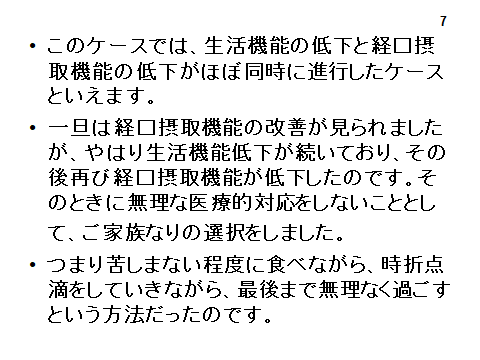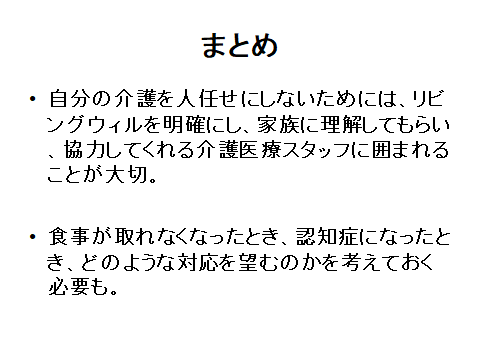 老老介護の場合は、周りの支えが大切になります。無理なことはしたくないと言いました。リハビリもやっていましたが夜 眠れなくなり、睡眠薬を使っており、夜せき込み始めるようになったのです。痰の吸引にしても、おばあちゃんができるよ うにするため、毎日のように往診に通いました。その後、私は睡眠薬を切りましたが、老後の介護を支えるのは、この介護 するおばあちゃんを支えるのがターミナルケアのポイントなのです。そのうち食事が取れなくなりました。胃ろうという方 法も勧めましたが、点滴をさせるのは無理なのですが、徐々に慣れていくことが必要です。だんだん弱っていく人を介護す る人の周りを支えるのが必要です。このケースではおじいちゃんが「無理をしないで」と言っていた。その人の思いをなし 遂げたという思いが大切です。 終末期に大切なのは本人の意思の明確化です。