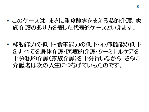 幸せな家族の例です。娘もその夫も協力していました。介護者が父親の葬儀の後に言った「父親移乗の介護をいつか夫にするから、そのときはよろしくね」と言われた言葉は、次につなげる介護の在り方を示しています。訪問入浴サービスをしてあげよう という私的介護の例はかなりあります。でも実は1、2、3例目が多いのです。これは恵まれたケースです。だから私たちは恵 まれた事例だけで判断してはいけないのだと思います。これからの人がこのようにもっともっと幸せになるために考えなければ なりません。