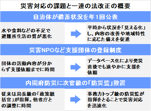 を毎年公表することを求める改正災害対策基本法について取り上げます。