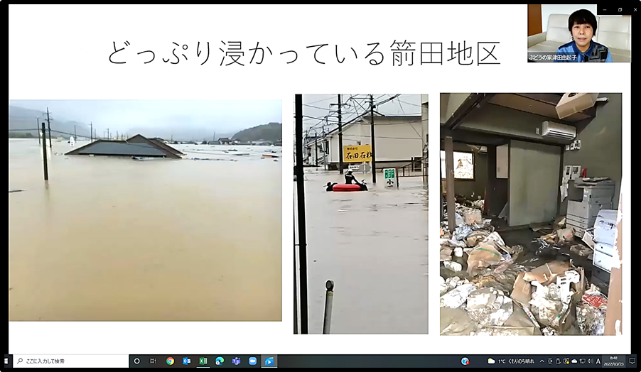 西日本豪雨被災から避難、事業所活動継続に至るまでの様子を丁寧にお話くださいました。また、被災経験を活かして、地域ぐるみで取り組む【サツキプロジェクト】についても活動の様子を動画を通して伝えていただきました。