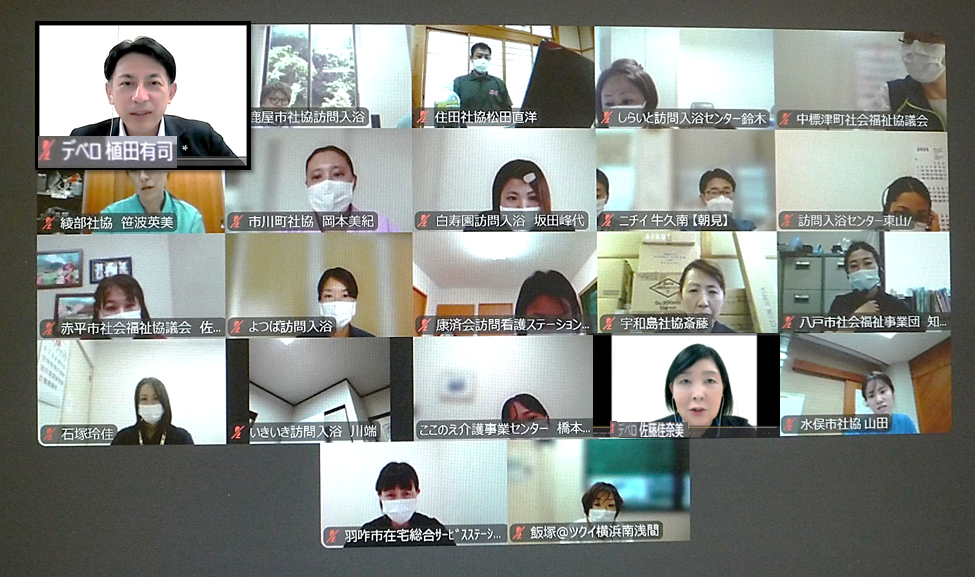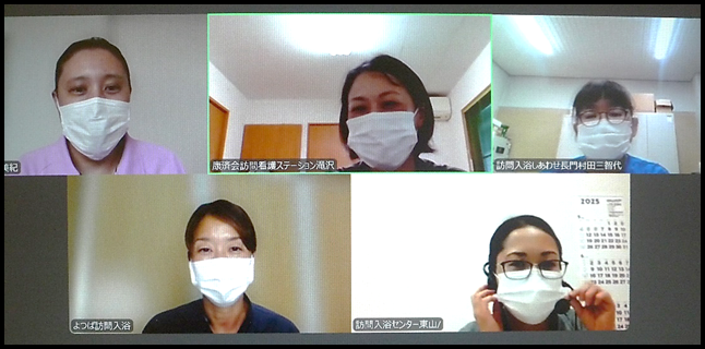 Zoomの機能により5つのグループに分かれて、意見交換を行っていただきました。各事業所のヒヤリハット事例やリスク回避の方法をはじめ、ベッドから浴槽への移乗・移動方法及び移乗補助用具について、またふだんの業務で疑問に感じていることなど、自由にお話しいただきました。