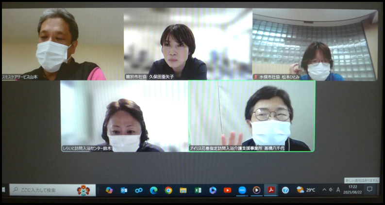 災害時の初期対応方法をはじめ、研修や訓練、訪問入浴の機材や移乗方法等、45分間ではありましたが、活発に意見の交換、情報の共有を図っていただきました。